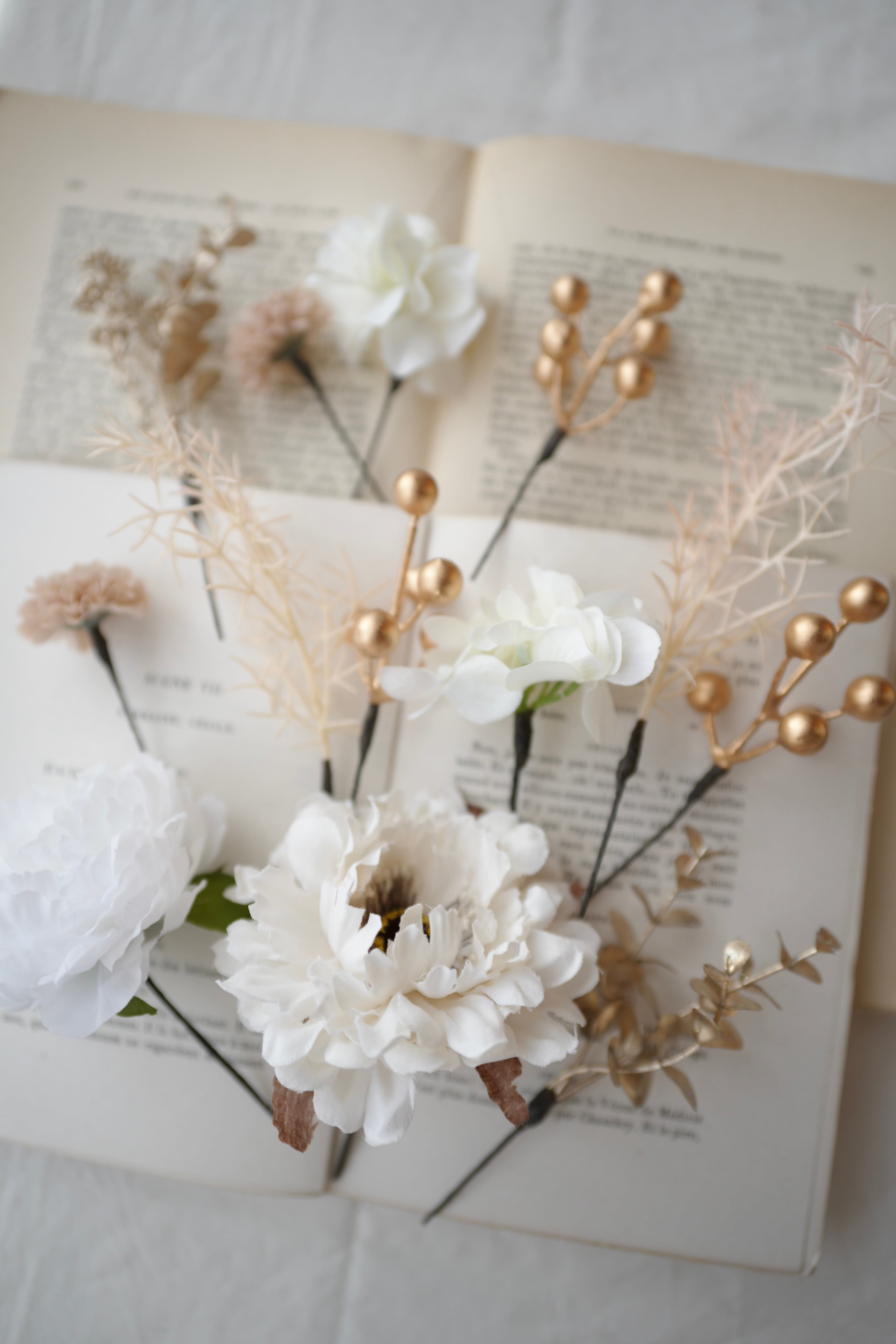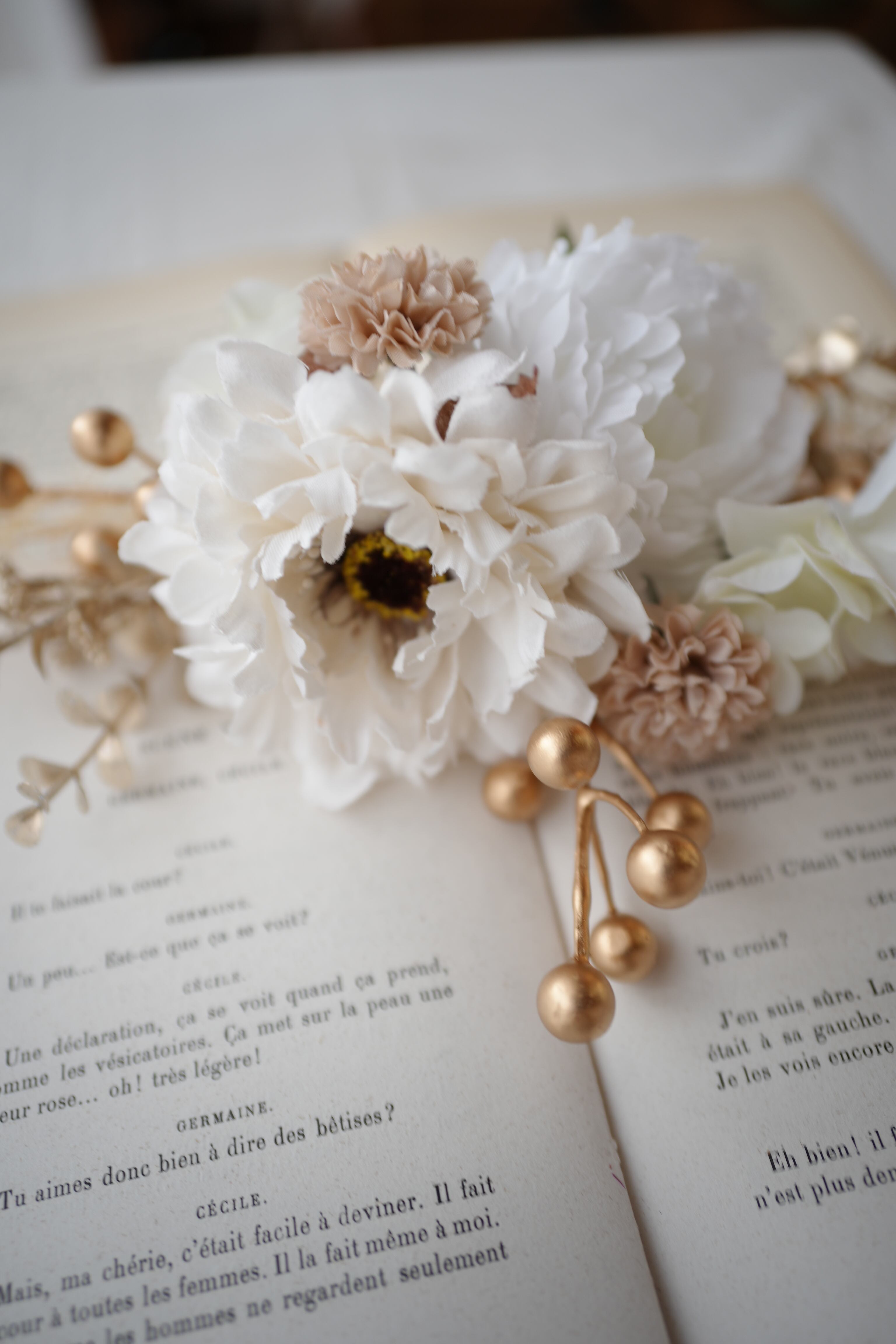 白、アイボリー、ゴールド、フェミニンて優しいお花の組み合わせ。